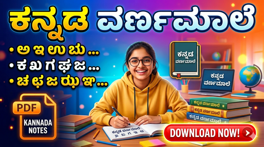 ಈ ಪುಟದಲ್ಲಿ ಕನ್ನಡ ವರ್ಣಮಾಲೆಯ ಸಂಪೂರ್ಣ ವಿವರವನ್ನು ಸರಳವಾಗಿ ನೀಡಲಾಗಿದೆ. ಸ್ವರಗಳು ಮತ್ತು ವ್ಯಂಜನಗಳನ್ನು ಸುಲಭವಾಗಿ ಅರ್ಥವಾಗುವಂತೆ ಉದಾಹರಣೆಗಳೊಂದಿಗೆ ವಿವರಿಸಲಾಗಿದೆ. ಇದು ವಿದ್ಯಾರ್ಥಿಗಳಿಗೆ ಓದಲು, ಬರೆಯಲು ಮತ್ತು ಪರೀಕ್ಷೆಗೆ ತಯಾರಾಗಲು ತುಂಬಾ ಉಪಯುಕ್ತವಾಗುತ್ತದೆ.